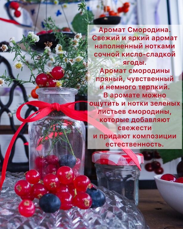 Аромат Смородина. Свежий и яркий аромат наполненный нотками сочной кисло-сладкой ягоды. Аромат смородины пряный, чувственный и немного терпкий. В аромате можно ощутить и нотки зеленых листьев смородины, которые добавляют свежести и придают композиции естественность.