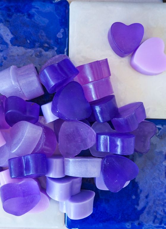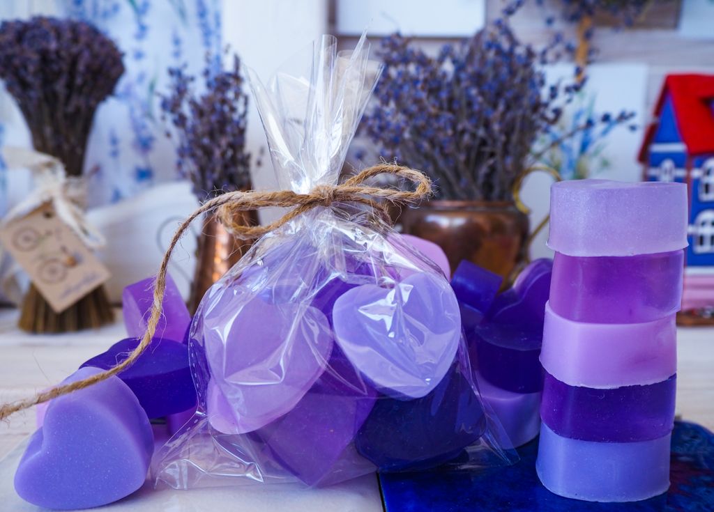 Мыло лавандовые сердечки. Небольшие кусочки мыла разных оттенков лаванды, аромат Прованс. В симпатичном подарочном пакете ПВХ перевязанный пеньковым шнурком.