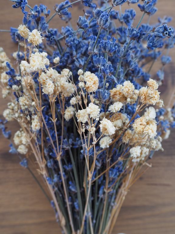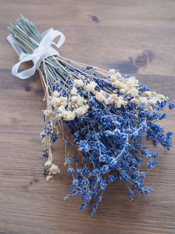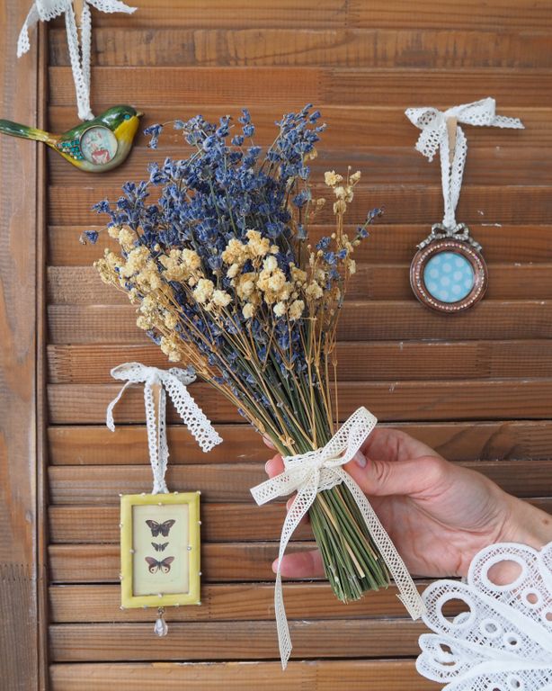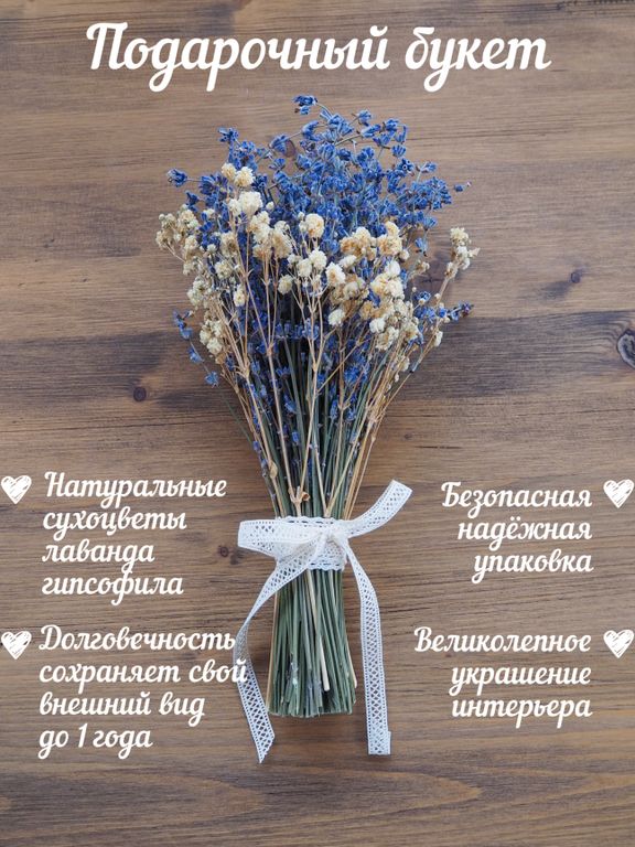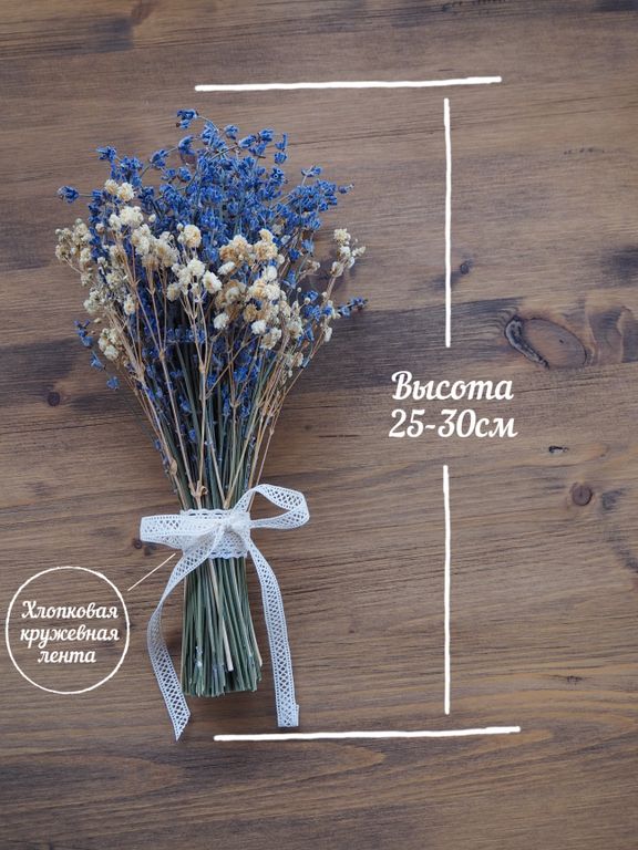 Сформированный букет из лаванды и гипсофилы, декорированный кружевной хлопковой лентой - это удивительное сочетание натуральной эстетики и долговечности, которое станет великолепным украшением любого интерьера. Этот уникальный букет идеально подходит как для личного использования, так и в качестве презента для ваших близких и друзей.