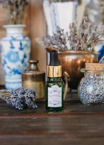 Натуральное эфирное масло лаванды в симпатичном пузырьке с функциональной крышкой-пипеткой, которая обеспечивает экономичный расход масла.
